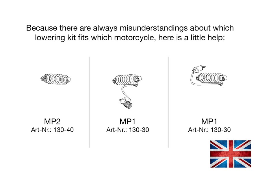 Tipp! Falls du unsicher bist, welche Variante für dein Motorrad passt: wenn deine Harley® eine Möglichkeit zum Verstellen der Federhärte hat (sitzt unter dem Öltank auf der rechten Seite), dann brauchst du die Variante MP1. In allen anderen Fällen MP2. Siehe dazu auch die Grafik in den Bildern! Immer vorausgesetzt natürlich, dass es ich um einen Milwaukee-Eight™ Motor handelt. Für Evo oder Twin Cam Motor haben wir diese Tieferleger im Programm.