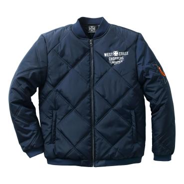 Navy doppelt genähte, gesteppte MA-1-Jacke. Dieses Alltagsstück ist nicht nur angenehm zu tragen, sondern hält Sie dank der Wattierung auch an kühlen Morgen- und Abenden warm. Mit vielen Details ist es ein besonderes Stück in unserer Sammlung.
