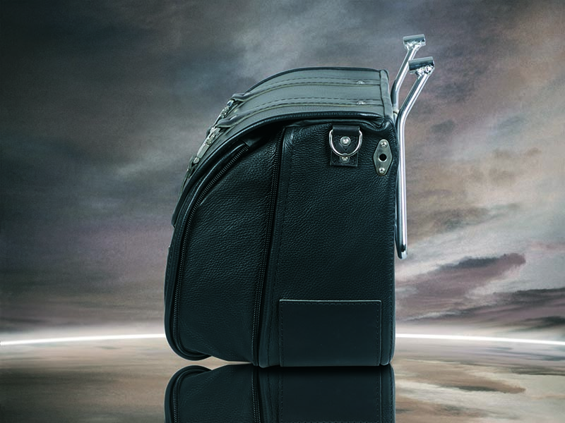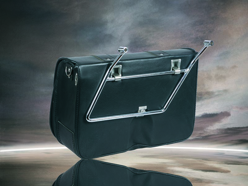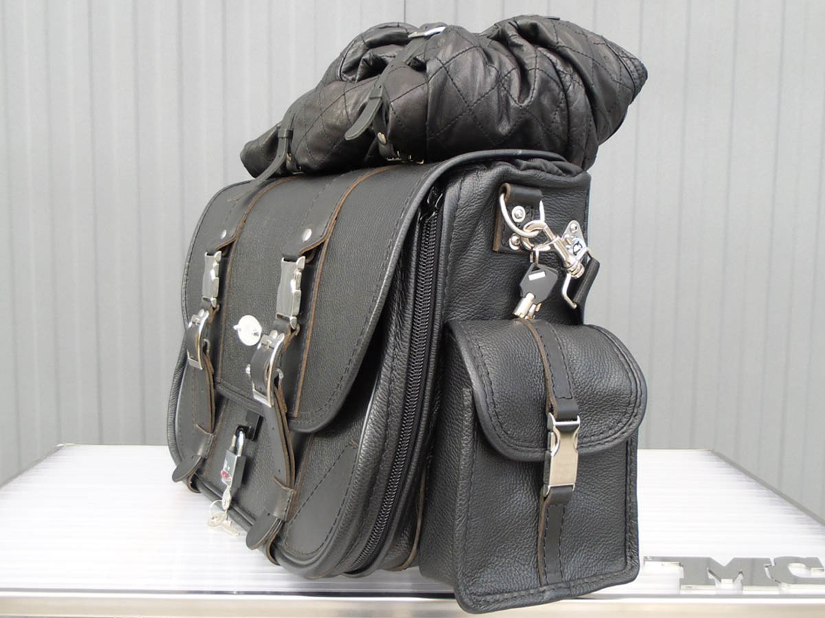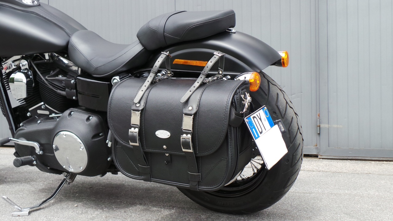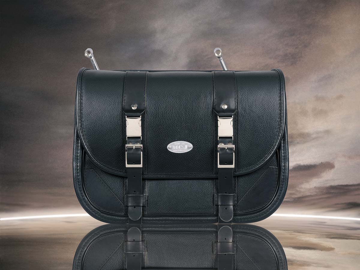 MCJ Classic Black Bag Black Seams Seitentasche Leder mit Halterung für Harley , Triumph, Kawasaki, Victory, Triumph, Royal Enfield
