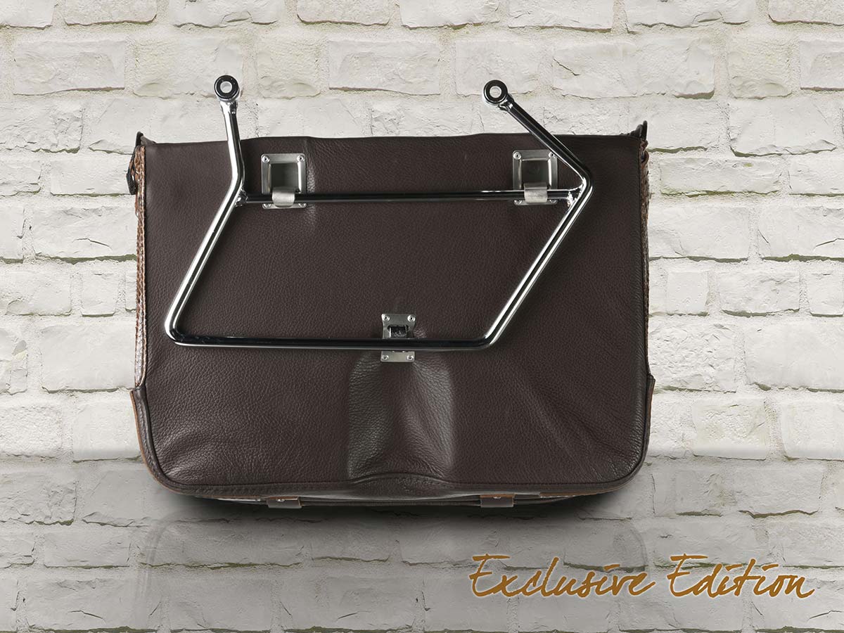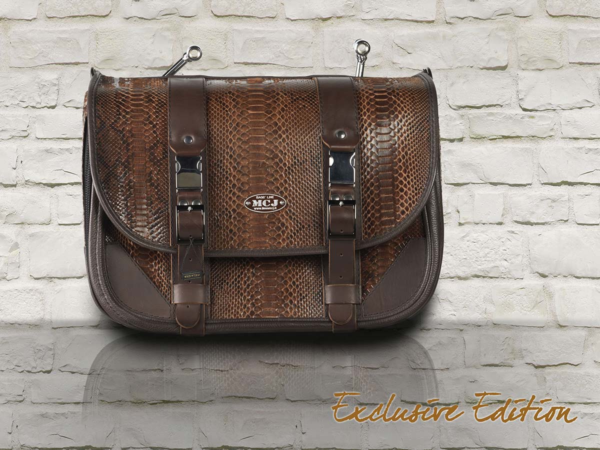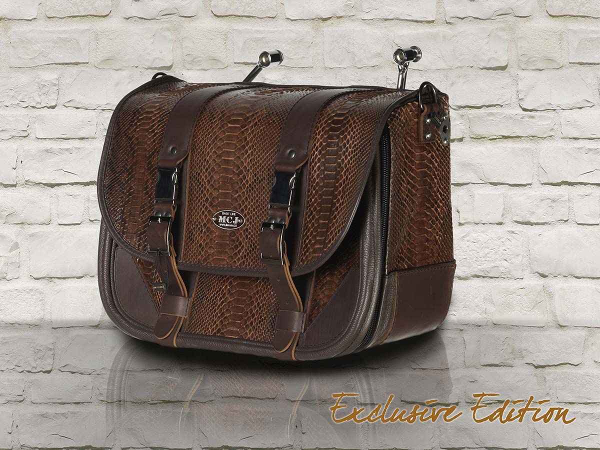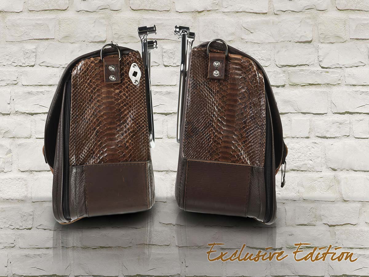 MCJ Brown Python Exclusive Bag Seitentasche Leder mit Halterung für Harley , Victory, Kawasaki, Triumph, Royal Enfield