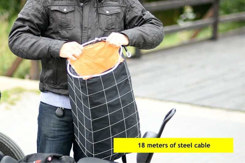 Zwischen der robusten Außenhülle und der samtig weichen Innenhülle sind 18 Meter flexibles 5mm starkes Stahlseil vernäht. Die Nylon Außenhülle ist wasserdicht und sehr robust gegenüber äußeren Einflüssen. Die samtig weiche Innenhülle schützt ihren Inhalt vor Kratzern oder ähnlichem. Die ausgeklügelt vernähten Stahlseile verhindern ein Aufschneiden des Helm Guard. Der durchdachte Verschluss der Tasche sowie die Befestigung am Motorrad mittels Qualitätsschloss verhindern dass der Helm Guard unbefugt geöffnet bzw. mitgenommen werden kann! Er lässt sich übrigens an jeder Art von Motorrad problemlos und sicher befestigen!